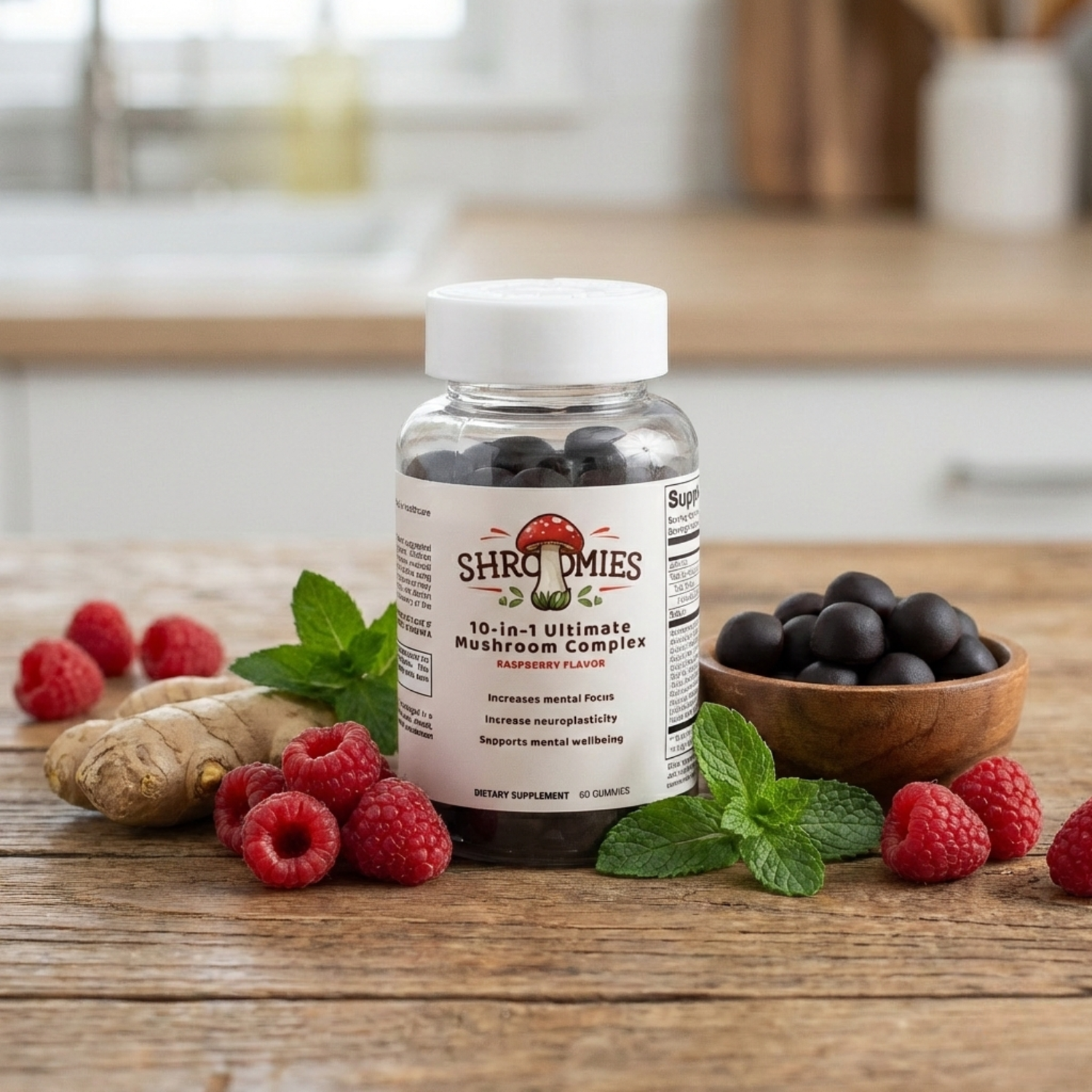 Ingredients: Mushroom extract (Maitake, Shiitake, Lion’s Mane, Reishi, Cordyceps, Chaga, Turkey Tail, White Button, Black Fungus, Royal Sun Mushrooms), glucose syrup, sugar, dextrose, pectin, citric acid, natural raspberry flavor, sodium citrate, purple carrot juice concentrate, palm oil (carnauba wax).