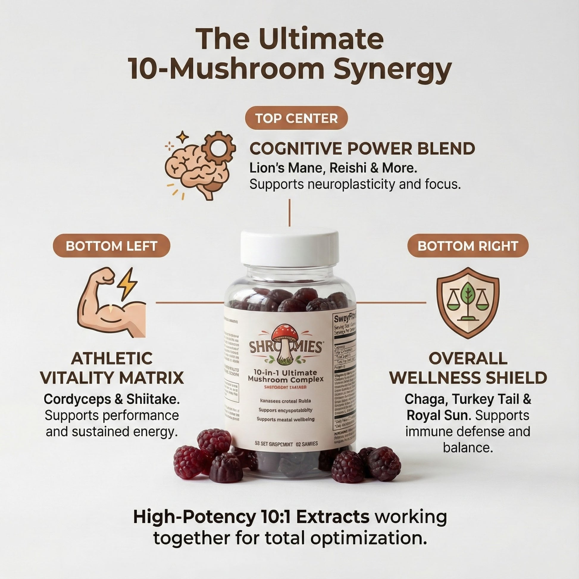 Our Mushroom Extract Complex Gummies feature a powerful blend of the world’s most sought-after mushrooms: Maitake, Shiitake, Lion's Mane, Reishi, Cordyceps, Chaga, Turkey Tail, White Button, Black Fungus, and Royal Sun Mushrooms. These gummies are designed to support cognitive function, energy levels, and athletic performance—ideal for those with active lifestyles.